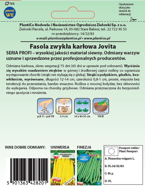 Tagy : fazuľa, fazuľa kríčková, Jovita, strukovina, osivo, semená, záhrada, pestovanie, zelenina, mrazenie, bez vlákien, odolná odroda, poľné pestovanie, zelené struky, zdravá výživa, Plantico, PROFI séria