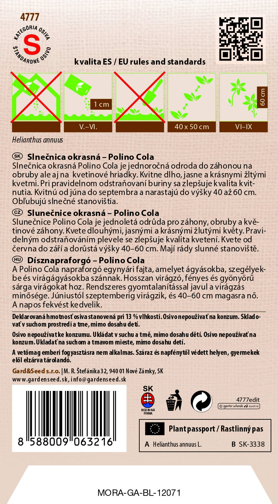 Slnečnica okrasná – Polino Cola je nízka, kompaktná jednoročná odroda so sýtožltými kvetmi, ktoré kvitnú dlho a bohato. Dorastá do výšky 40–60 cm, čo ju predurčuje na pestovanie v záhonoch, na obrubách aj v kvetinových nádobách. Pri pravidelnom odstraňovaní buriny dosahuje ešte lepšiu kvalitu kvitnutia. Je odolná voči suchu a priťahuje včely aj motýle.