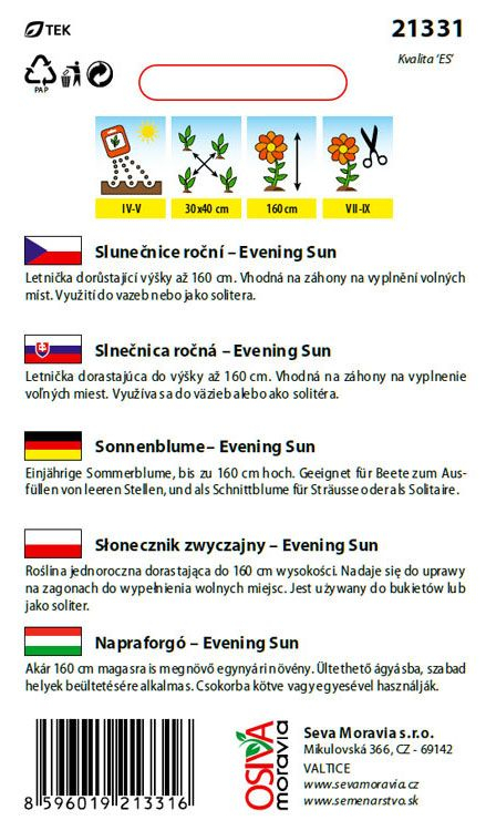 Slnečnica ročná Evening Sun je majestátna letnička, ktorá do vašej záhrady vnesie hrejivé farby neskorého leta. Na rozdiel od klasických žltých odrôd sa vyznačuje kvetmi v nádherných odtieňoch od sýto oranžovej až po tmavočervenú a hnedastú, čo pripomína farby zapadajúceho slnka. Dorastá do výšky až 160 cm, vďaka čomu je ideálna ako pôsobivý solitér alebo na vyplnenie voľných miest v pozadí záhonov. Jej pevné stonky a atraktívne kvety sú vynikajúce aj na rez do vázy, kde vytvoria originálnu a dlhotrvajúcu dekoráciu.