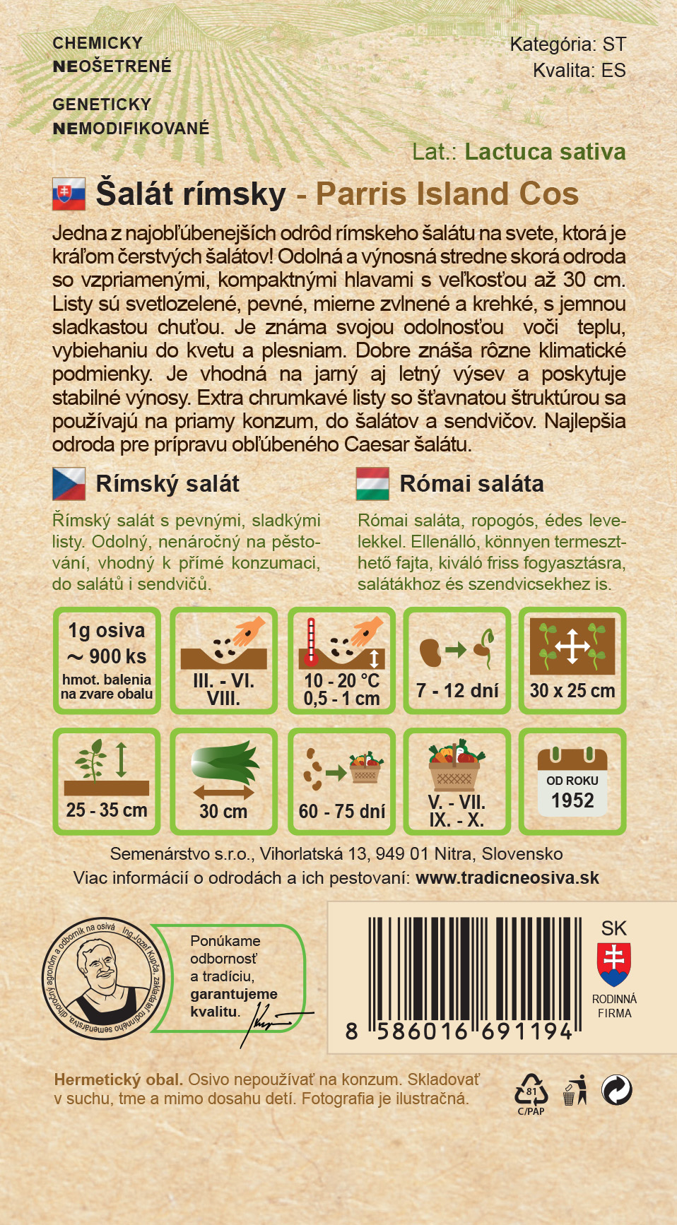 Parris Island Cos patrí medzi najslávnejšie a najobľúbenejšie odrody rímskeho šalátu na svete. Ide o stredne skorú, výnosnú a odolnú odrodu, ktorá vytvára vzpriamené, kompaktné hlávky dorastajúce do 30 cm. Listy sú svetlozelené, pevné, jemne zvlnené, veľmi chrumkavé a s príjemnou sladkastou chuťou. Výborne znáša teplo, je odolná voči vybiehaniu do kvetu aj voči plesniam, čo z nej robí mimoriadne spoľahlivú odrodu pre jarný aj letný výsev.